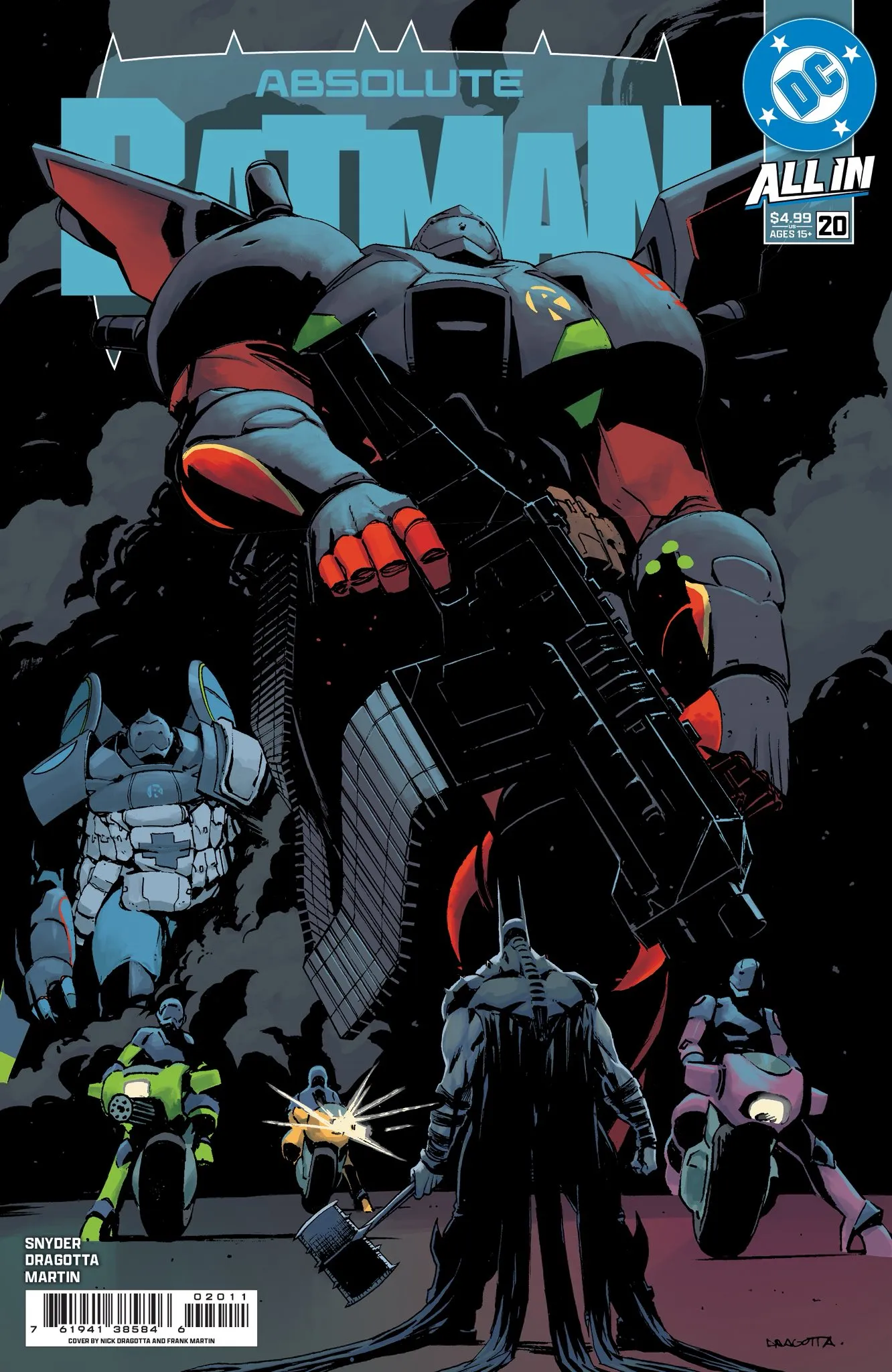 Snyder acaba de revelar la portada completa de Absolute Batman #20, ilustrada por Dragotta y coloreada por Frank Martin, un día antes de su lanzamiento oficial.