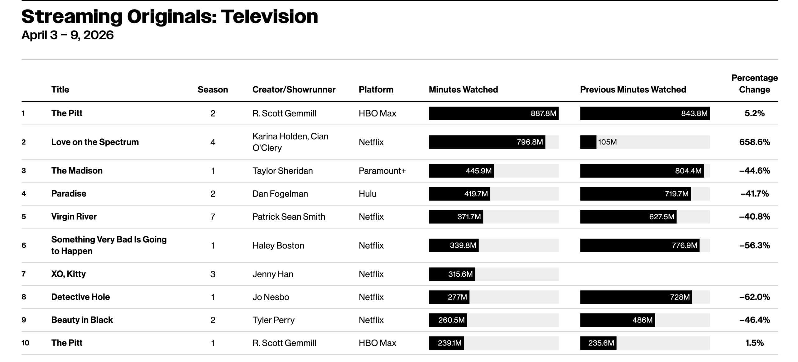 La temporada 1 de The Pitt también tuvo un buen desempeño, ubicándose en el puesto número 10 con 239,1 millones de minutos vistos. Sorprendentemente, una temporada que se emitió originalmente hace un año todavía atrae a una audiencia significativa.