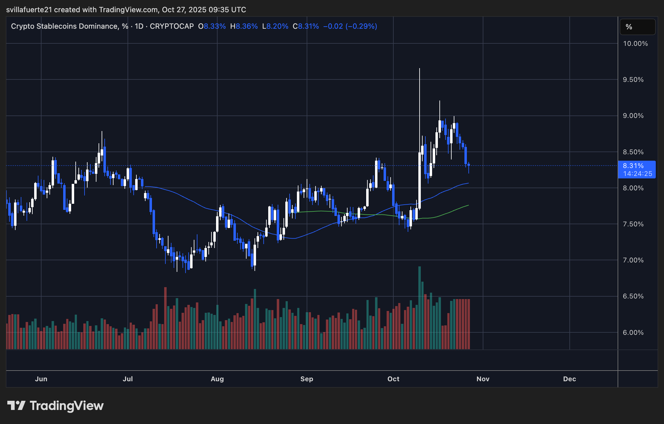 El gráfico revela que el dominio del mercado de las monedas estables se sitúa actualmente en el 8,31%, tras un fuerte aumento a principios de octubre que elevó la proporción por encima del 9%. Estos niveles a menudo indican una mayor demanda de liquidez y seguridad, a medida que los comerciantes buscan refugio de las tempestades de los criptomercados. Se podría comparar con un salón de baile donde todos los invitados han huido a los jardines para evitar la lluvia.