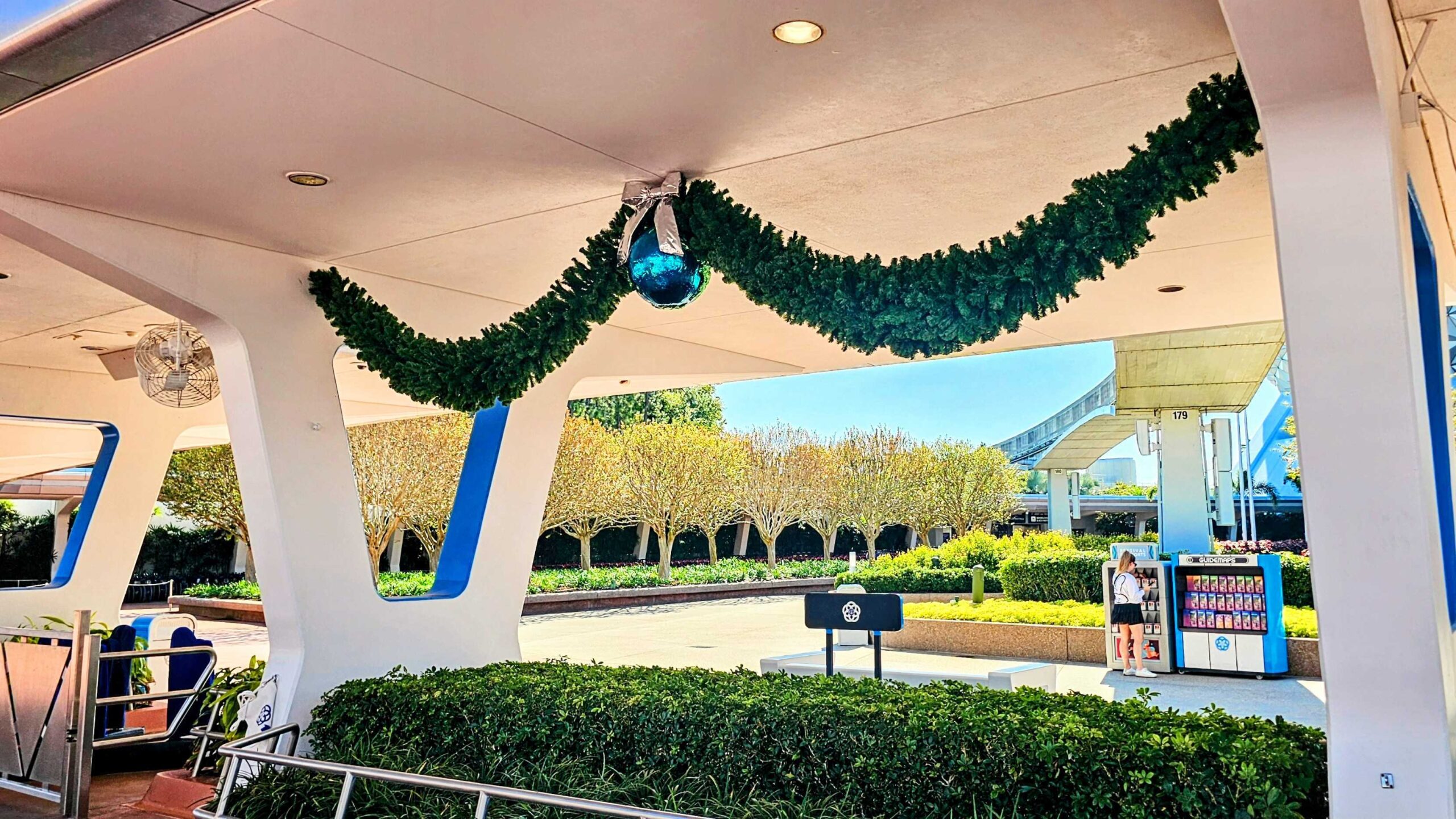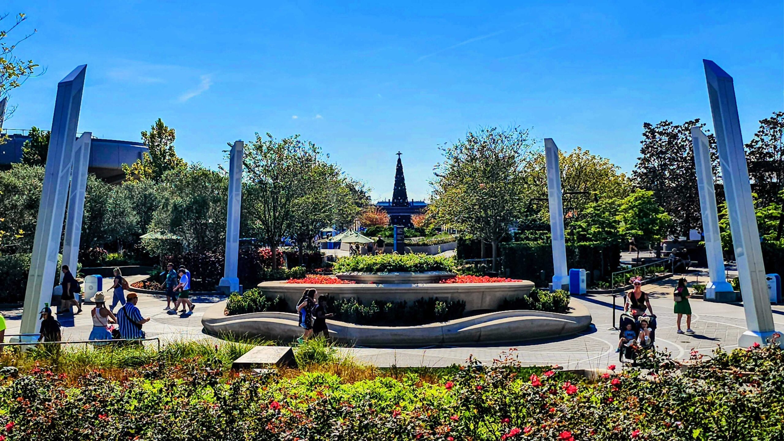 ¡Recientemente visitamos Epcot y vimos que se estaban colocando decoraciones navideñas! Tenían guirnaldas con adornos de color azul brillante en la entrada, junto con poinsettias rojas y verdes y otras flores en las macetas. También ha llegado el principal árbol de Navidad internacional del parque.
