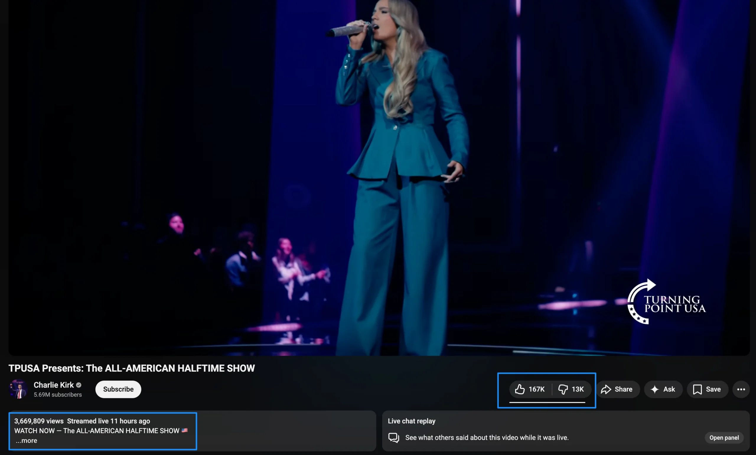 Actualmente, el vídeo del evento, que está archivado en el canal principal de YouTube de Turning Point USA, ha recibido más de 19 millones de visitas de personas que lo vieron después del evento en vivo, lo que demuestra un interés continuo mucho después de su emisión original.