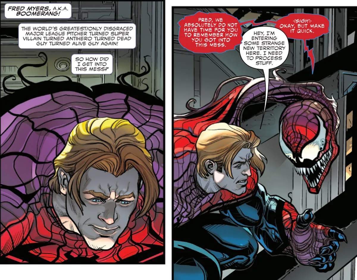 Si su plan fracasa, los dos personajes comienzan a luchar contra los guardias. El simbionte explica que puede transformarse en casi cualquier arma y el anfitrión comienza a lanzar bumeranes hechos con su sustancia. Esta habilidad es la clave para descubrir quién es el anfitrión, y luego un flashback muestra cómo se vinculó por primera vez con el simbionte. El flashback también explica por qué su disfraz se basó en Spider-Man, incluso antes de que comenzara a intentar copiar al héroe.