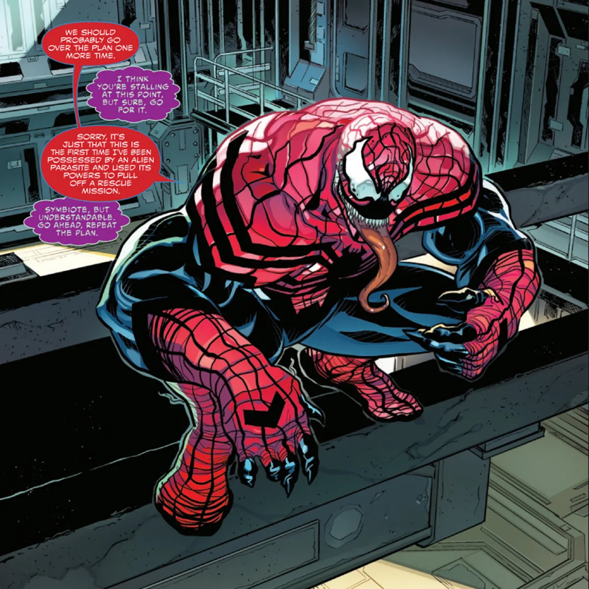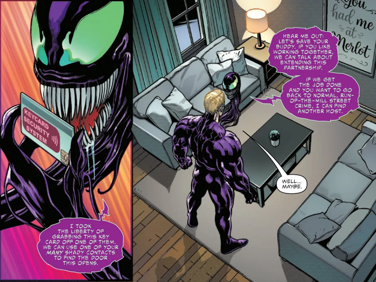El primer número de Web of Venom, escrito por Jordan Morris e ilustrado por Luke Ross y Ramon Rosanas, comienza con el improbable equipo que intenta sacar a alguien de prisión. Rápidamente se hace evidente que la conexión entre el anfitrión y el simbionte aún se está desarrollando. A pesar de esto, se les ocurre un plan para disfrazarse de Spider-Man y engañar a los guardias para que liberen al objetivo previsto.