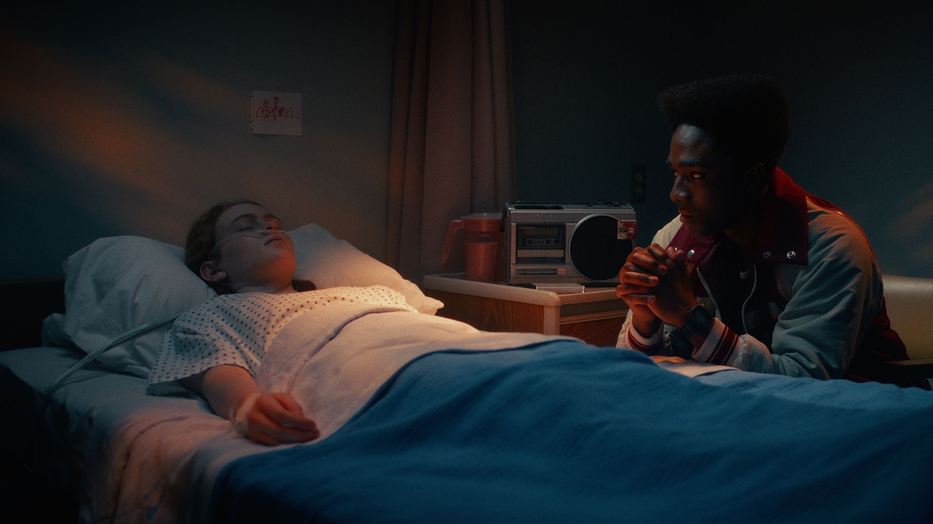 Max revela que ha estado navegando a través de los recuerdos de Vecna y que casi pudo escapar. Pudo verse brevemente de regreso en el hospital, con Lucas a su lado. La guió la canción “Running Up That Hill” de Kate Bush; Lucas suele tocarla para ella cuando la visita. Sin embargo, justo cuando estaba a punto de regresar, la canción dejó de sonar en el mundo real y la conexión se cerró. Lucas, sin saberlo, impidió su escape al detener la música y no se dio cuenta de lo cerca que estaba de despertar.