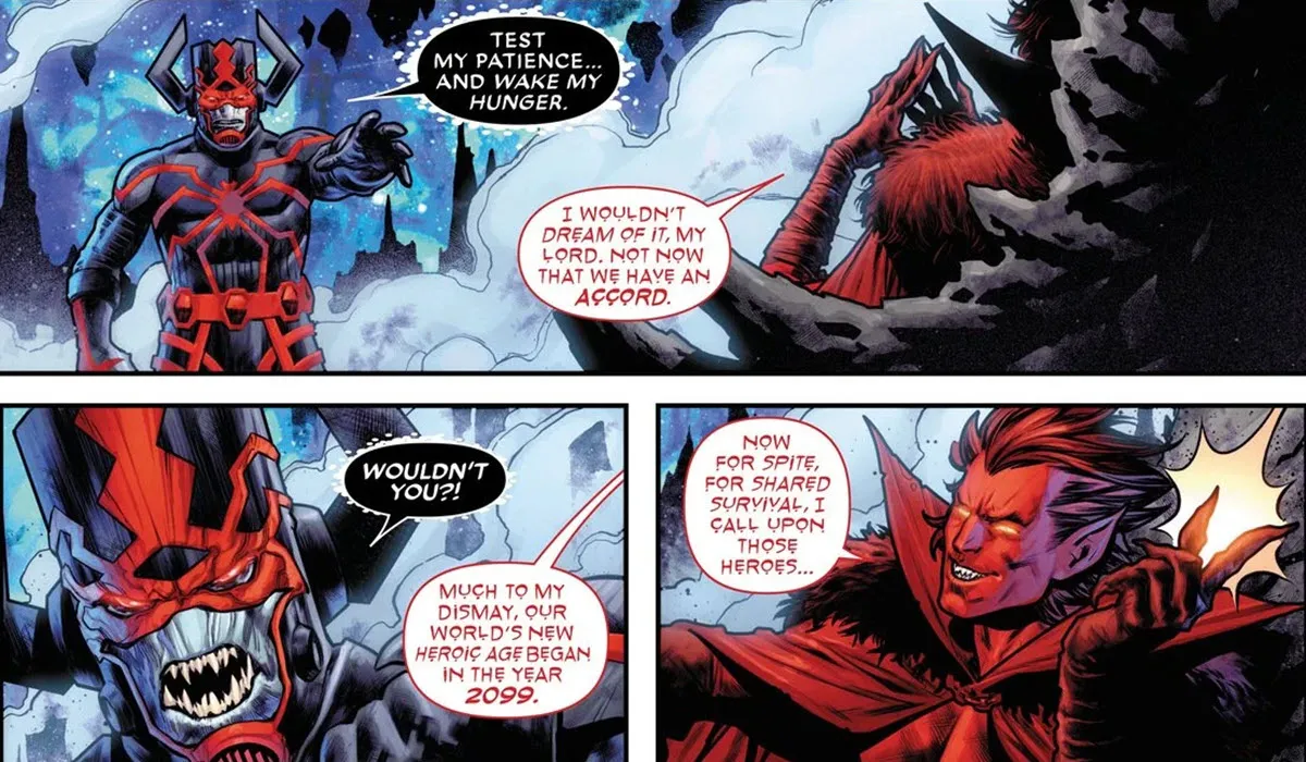 Galactus logró liberarse del dios simbionte alienígena y, usando el Ultimate Nullifier, los destruyó a ambos. Sin embargo, este acto fue en realidad parte de un plan de Mephisto, quien sorprendentemente salvó el futuro simplemente para beneficiarse a sí mismo. Este giro de los acontecimientos fue particularmente irónico porque en última instancia evitó el mismo “Fin” que la miniserie Marvel 2099 parecía presagiar.