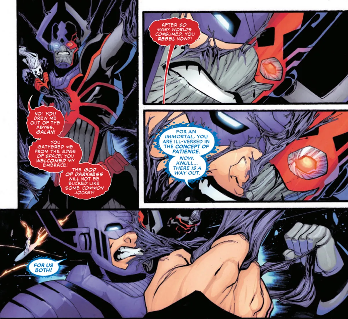 Sin embargo, los héroes no querían usar el Ultimate Nullifier. En cambio, se lo dieron a Galactus, cuyos exploradores habían notado que estaba horrorizado por la maldad de Knull, especialmente porque se habían unido. También señalaron el terrible precio de utilizar el Nullificador.