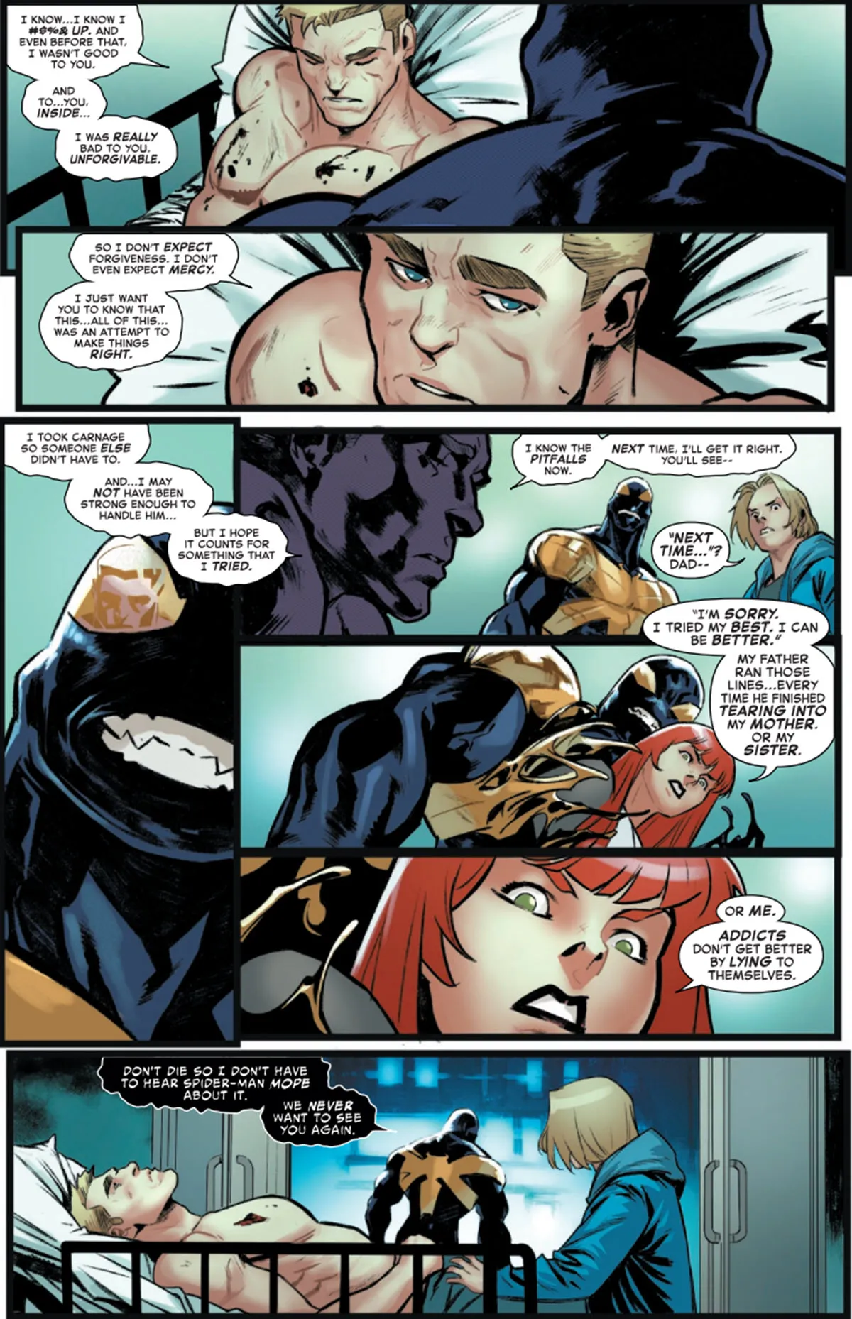 Dylan cuestiona la afirmación optimista de Eddie de que tendrá éxito la próxima vez, señalando que supone que habrá una próxima vez. Mary Jane es más directa, confronta a Eddie sobre su adicción y establece un doloroso paralelo entre sus disculpas vacías y las promesas incumplidas de su padre abusivo. Incluso el simbionte de Venom se muestra antipático y le dice fríamente a Eddie que se mantenga con vida simplemente para evitar escuchar a Spider-Man quejarse de ello después.
