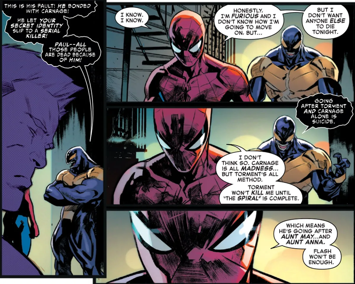 Amazing Spider-Man #26, escrito por Joe Kelly e ilustrado por Francesco Manna y Ed McGuinness, es parte del evento Death Spiral en curso de Marvel. La historia se centra en la búsqueda de Spider-Man del peligroso asesino Torment. La situación se vuelve crítica cuando Torment se fusiona con el simbionte Carnage y comienzan a apuntar a las familias de Peter Parker y Mary Jane Watson.