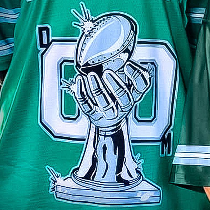 El patrón de la camiseta se parece al Trofeo Vince Lombardi del Super Bowl, pero está diseñado para parecerse a la mano blindada del villano Doctor Doom.