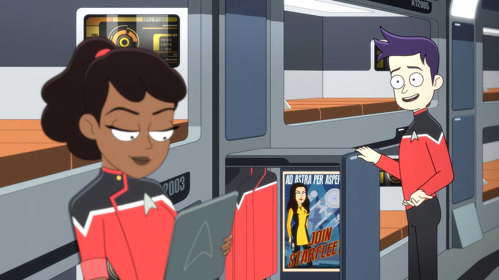 El alférez Brad Boimler (Jack Quaid) confesó tímidamente que se unió a la Flota Estelar porque era fanático de Número Uno, e incluso tenía un póster de ella en su habitación. El cartel presenta su famosa cita, “Ad Astra Per Aspera”, que se ha convertido en una especie de lema no oficial de la nueva serie Star Trek en Paramount+.