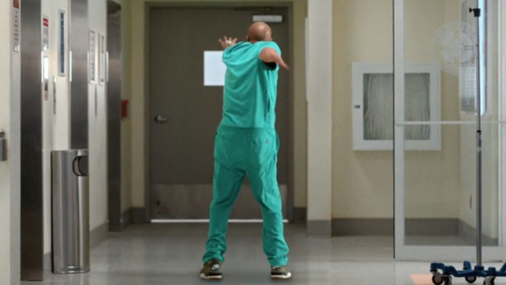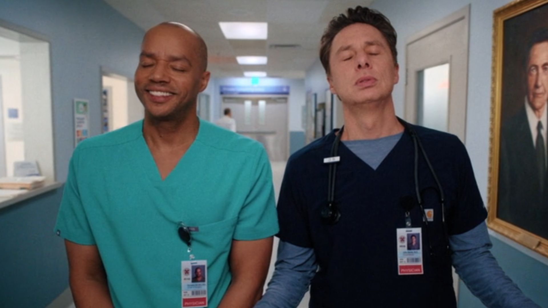 Okay, so things get really weird when Turk tells JD to just “summon his big doctor energy and glide away” to avoid watching Dr. Cox and Dr. Park interact. Then, poof, another white flash, and honestly, not much changes. Now Turk and JD are just gliding together to Jamiroquai. But here’s the thing that really bugs me: I can still see Cox and Park having a good time down the hall. It feels like it should be a clear fantasy sequence, but it’s not distinct enough from reality, and it doesn’t really match what Zach Braff seems to be going for with these new cutaways. It’s the opposite of something totally outlandish happening – it’s almost too realistic, which is what’s making it feel like the start of a fantasy in the first place.