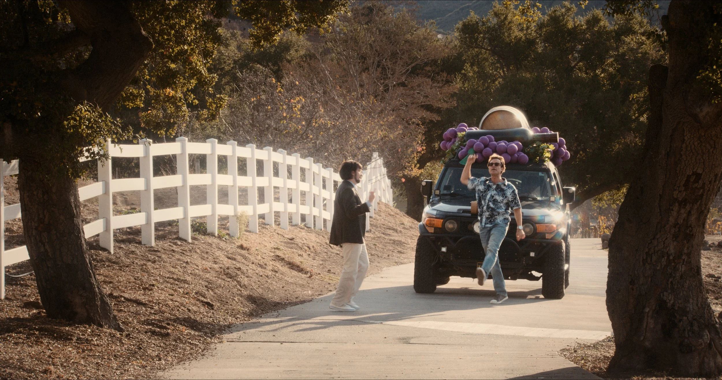 Honestamente, es mejor no pensar demasiado en The Napa Boys. La mejor manera de vivirlo es como un paseo sin preocupaciones por la región vinícola; generalmente puedes seguir la historia, pero es más divertido dejarte llevar. Cuando la película es buena, es realmente buena. Presentada como la cuarta entrega de una serie inventada claramente inspirada en el trabajo de Alexander Payne (The Napa Boys 4: The Sommelier’s Medallion), lleva su autoconciencia tan lejos que intencionalmente se vuelve caótica. Es similar a la famosa parte “mi esposa” de Borat de Sacha Baron Cohen. Ese chiste pasó de ser hilarante a molesto porque todos empezaron a copiarlo, y luego volvió a ser gracioso, pero de una manera irónica.