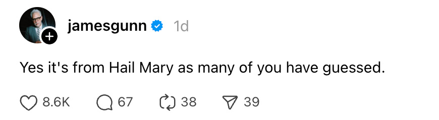 James Gunn aclaró recientemente que una publicación reciente en las redes sociales no estaba relacionada con Supergirl. Explicó en Threads que en realidad era un guiño a su nueva película, ‘Project Hail Mary’, que actualmente se encuentra en los cines.